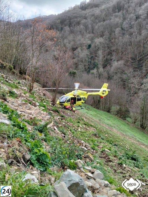 Ganadero lesionado en una remota cuadra de Brañasivil, Salas.